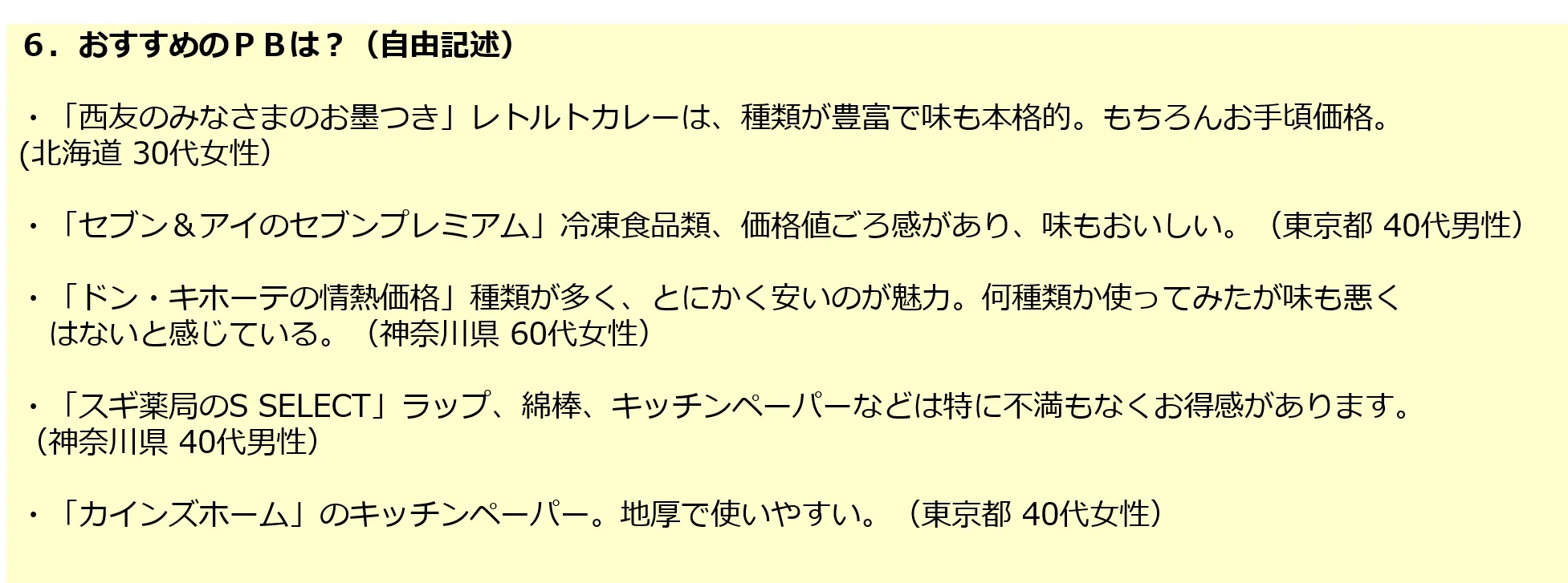 おすすめのPBについては、大手スーパーだけではなく、「ドン・キホーテ」などのディスカウントショップや、「カインズホーム」などのホームセンター、「スギ薬局」などのドラッグストアなどのPBが挙がり、様々な業態やチェーンでPBが展開されていることがわかりました。