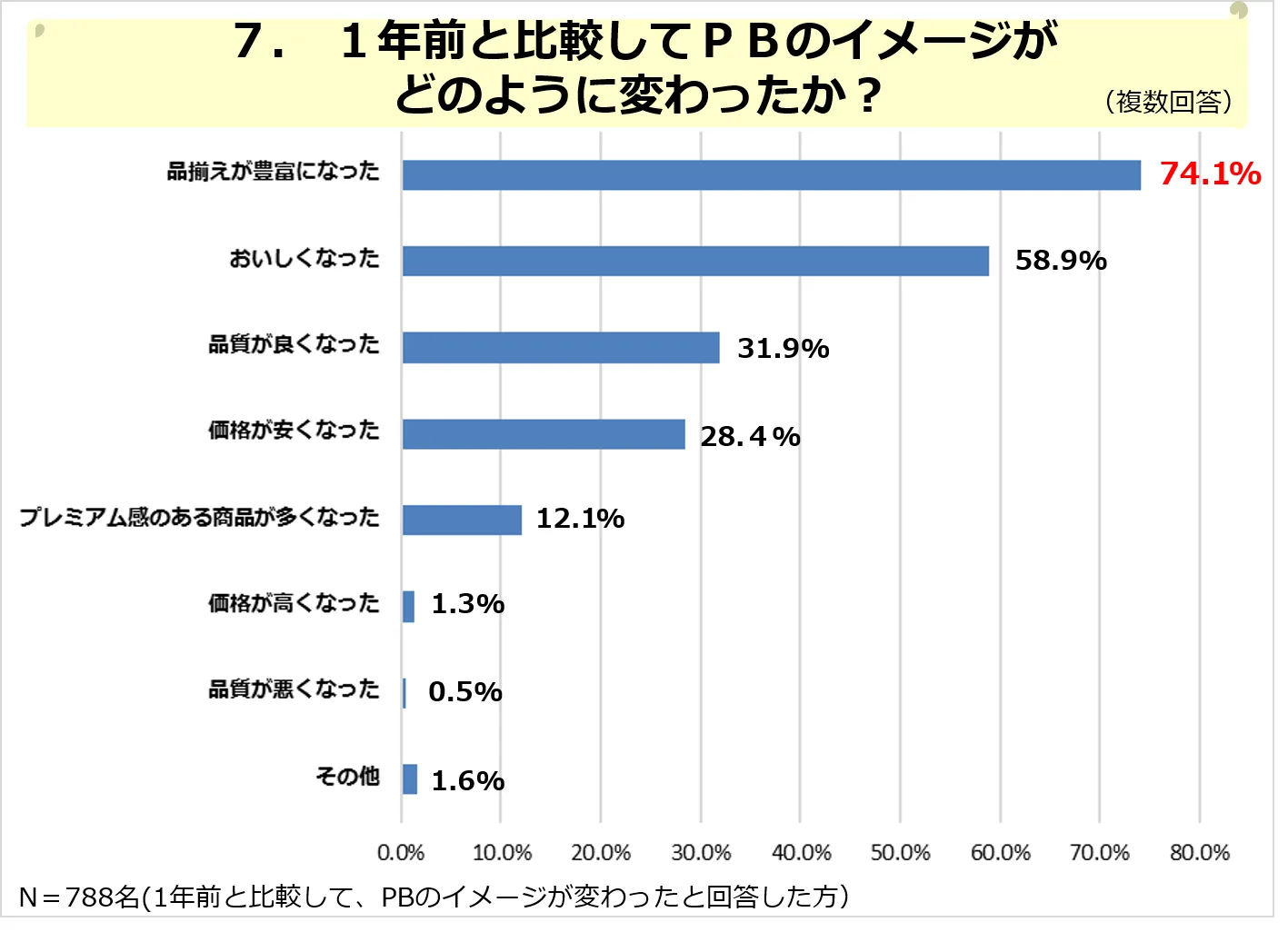 一年前と比較して、PBのイメージが変わったと回答した、788名(N=4,410名)に、どのように変わったかを聞くと、1位は、「品揃えが豊富になった(74.1%)で、2位は、「おいしくなった(58.9%)」、3位は、「品質が良くなった(31.9%)」、4位は、「価格が安くなった(28.4%)」5位は、「プレミアム感のある商品が多くなった(12.1%)」であり、1位から5位まではイメージが良くなったという回答が続きました。