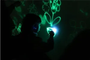 蓄光シートの壁にペンライトを使って自由に光で絵を描くことができます。描いたところが蛍のような光を放つ、幻想的なお絵描きを体験できる夜のワークショップです。