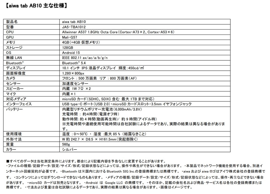 テクミラホールディングスの子会社であるアイワマーケティングジャパン株式会社(本社:東京都千代田区、代表取締役社長:藤岡 淳一、以下 アイワマーケティングジャパン)は、高画質での動画視聴が可能でネットワーク接続も快適な10.1インチのエントリーモデルAndroidタブレット【aiwa tab AB10】(以下 本製品)を、aiwaダイレクトサイトおよび各家電量販店、ネットショッピングサイトにて順次販売開始いたします。