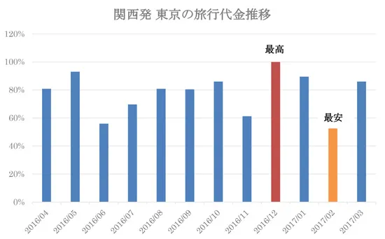 一方関東発の場合は、一番高いのが7月、一番安いのが3月といった違いが出ています。