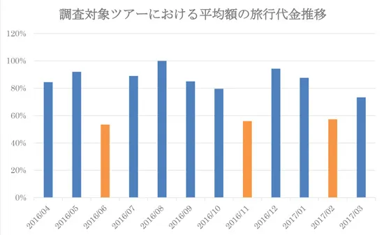 今回の調査に使った金額は、各月におけるツアーで一番高かった料金(需要が高い休前日などが対象となりやすい)を元にしています。一方各月で一番安かった料金については、目立った差はありません。