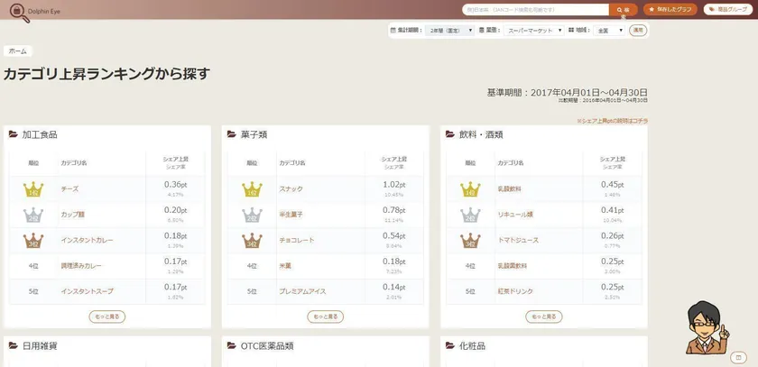「ドルフィンアイ」は、ドラッグストアと食品スーパーにおける合計約5,000万人分のID付き購買データ(ID-POSデータ※)をベースにしており、利用者がウェブ上にアクセスするだけで、食品・日用品全500カテゴリにおよぶ商品の売れ行きや競合商品との比較などの営業資料を簡単に作成できるシステムです。今回の機能追加では、昨年と比べて市場シェアを伸ばしているカテゴリや、カテゴリ内の個別商品のシェア伸び率ランキングを表示します。マーケットシェアの上昇がランキングとして可視化されることで、マーケットシェアの「未来」を先読みできるようになります。