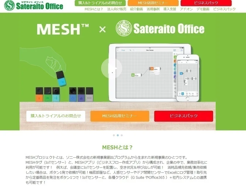 クラウド環境、サテライト環境でのビジネス支援に特化したインターネットシステムソリューションベンダーである株式会社サテライトオフィス(本社:東京都江東区、代表取締役社長:原口豊、 http://www.sateraito.jp/ )は、IoTセンサーとビジネスフロー作成ツールである「MESH」を利用した法人向けビジネスパックの第一弾として、会議室の効率化対策システムの販売を、2017年10月18日(水)より開始したことを発表します。