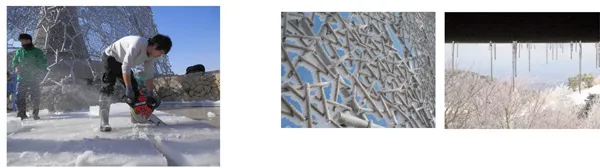 真冬には、六甲枝垂れを覆うフレームに樹氷が煌めきます。また、六甲枝垂れ内「山の展望所(風穴)」では、氷柱が出現します。