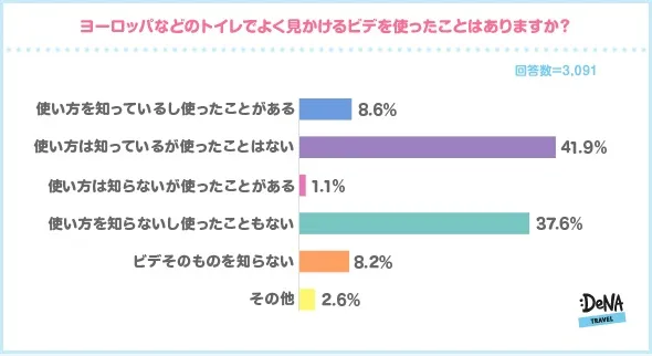 イタリアやフランスなどヨーロッパではよく見かけるトイレの横にある低い洗面台のようなもの。これは「ビデ」という名前で、下半身全般を洗うためのものです。日本人としては見慣れないものなので使い方も知らない人も多いのではないかと思いましたが、「使い方を知っているし使ったことがある」(8.6%)、「使い方は知っているが使ったことはない」(41.9%)と約半数の人が使い方を知っていることがわかりました。しかし、使い慣れていないものを使うのは抵抗があるようで「使い方を知らないし使ったこともない」(37.6%)と合わせると8割近い人が使用経験がないことがわかりました。
