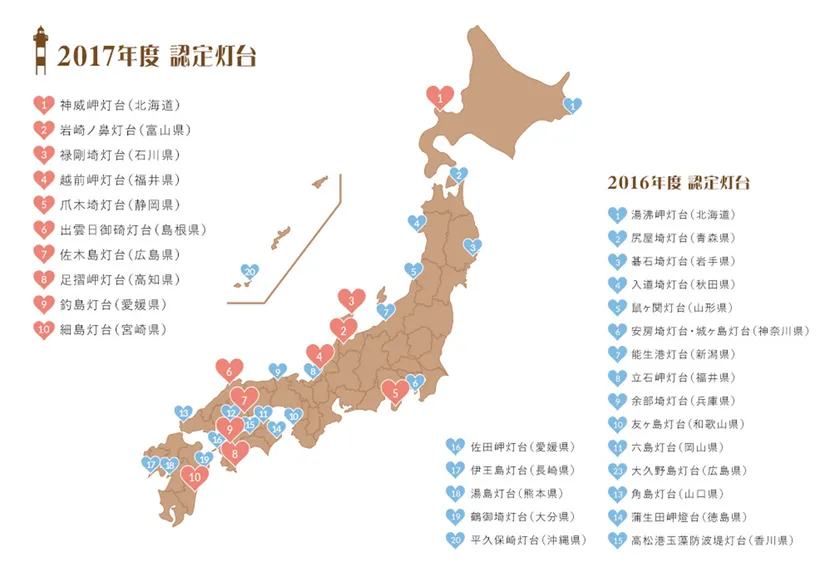 海への想いやロマンを感じられる灯台を「恋する灯台」と名づけ、日本ロマンチスト協会、協会員(2017年10月現在、約1,600名)の中から選抜したロマンス宣教師を中心に、有識者によって構成させる選考委員会にて決定しました。2016年、2017年で、全国30エリア・31個の灯台を「恋する灯台」として認定しました。