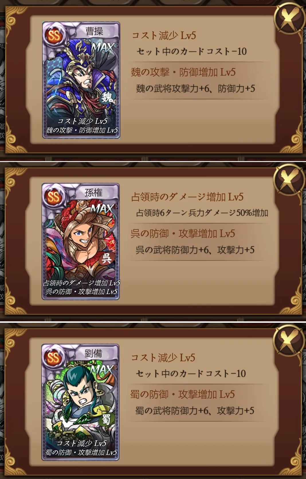 さらに、「魏」「呉」「蜀」の各武将・君主だけが当たる「国確定パック」も期間限定で公開いたします。曹操、孫権、劉備を君主にしているプレイヤーは、各国の武将をそろえる大チャンスです。君主が曹操なら、デッキを魏の武将で固めると、君主スキルが発動し武将の能力がアップします。