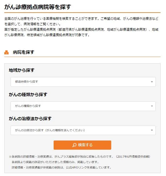 国が指定したがん診療連携拠点病院(都道府県がん診療連携拠点病院、地域がん診療連携拠点病院)、地域がん診療病院、特定領域がん診療連携拠点病院の計434施設を対象に、各病院の詳細情報・治療実績をがんプラス編集部が独自に収集。地域・がん種・治療法で絞込検索が可能。