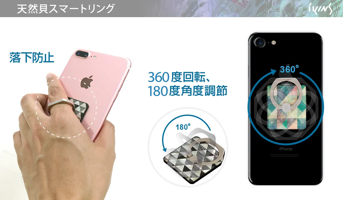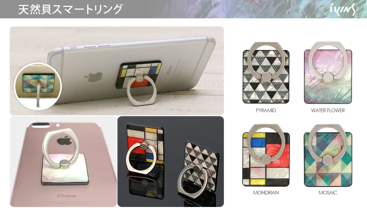 本製品は、スマホやタブレット等に貼り付けて使用し、端末本体の落下防止などに使用するリングです。天然貝の真珠質を使用した伝統技術「螺鈿(らでん)」風のベースに、モダンでアーティスティックなデザインを重ね合わせたおしゃれなスマホリングとなっています。