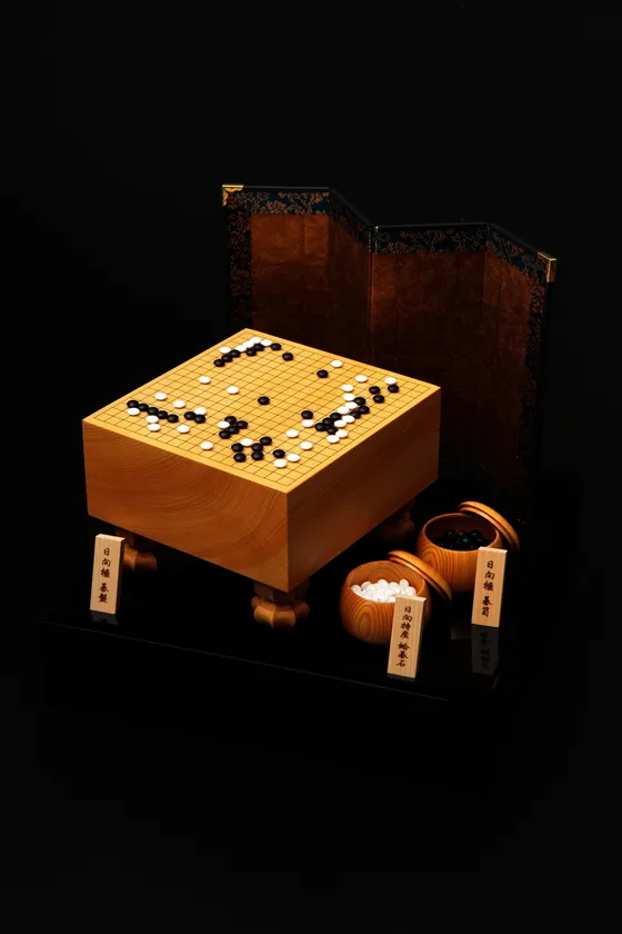 3.碁石を入れる容器である碁笥(ごけ)の材料にも『日向榧』を使用。宮崎県伝統工芸士である『西川ろくろ木工』の西川 嵩氏により作られた逸品です。西川氏製造の証である刻印入り。