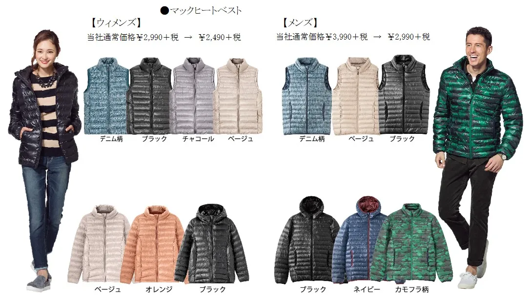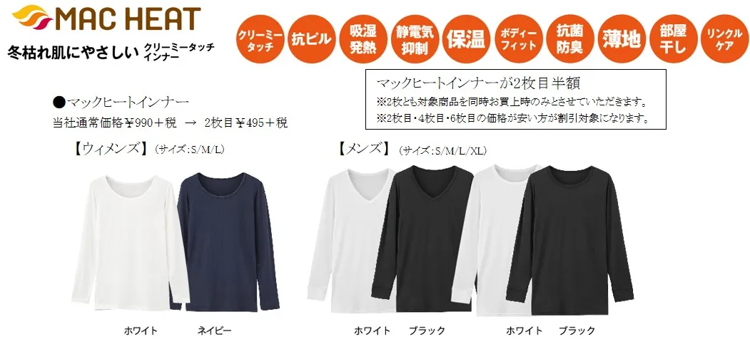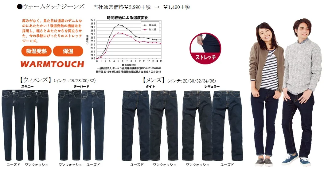 他にも吸湿発熱や保温に強い「ウォームタッチジーンズ」や裏起毛素材を使用したソフトな肌触りの「裏起毛パンツ」。また、これからの季節に必需品となった高機能の「マックヒートインナー」は、この機会にまとめ買いがおすすめです。