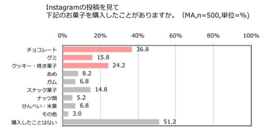 Instagramの投稿を見て購入したことがあるお菓子があるかを聞いたところ、48.8%があると回答し、お菓子の種類は「チョコレート(36.8%)」、「クッキー・焼き菓子(24.2%)」、「グミ(15.8%)」がランクイン。また、購入に至った理由を聞いたところ、「美味しそうだった(57.4%)」「可愛くて欲しくなった(50%)」「トレンドだと思った(44.7%)」と続きました。
