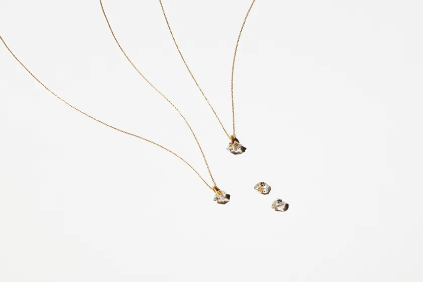 スリランカのラトゥナプラで採掘からカット・研磨に至るまで一貫して行われた、流通過程において透明性のあるサファイアをハーキマーダイヤモンドクォーツにあしらったジュエリーです。