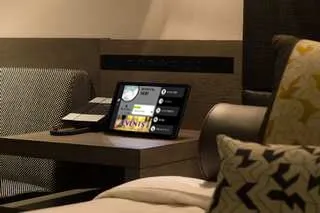 イータブ・プラスはホテルにおける宿泊者の利用目的や客室での過ごし方に合わせた機能やサービスを提供しています。この度ラグジュアリーホテル向けのサービス拡充の一つとしてパナソニック製4Kテレビと連携したリモコンアプリ機能を追加。客室の雰囲気を損なわないリッチな画面デザインとしたほか、タッチパネルを用いた直感的な操作を可能としました。