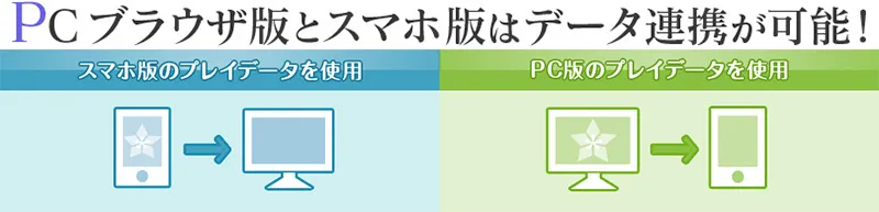 PCとスマートフォンの両方で同じデータをご利用いただけるため、「自宅ではPC版、外ではスマホ版で」といった、プレイスタイルに応じた遊び方が可能となります。
