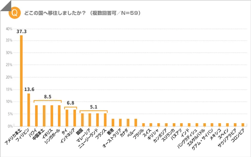 また「海外移住した理由」も聞いたところ、最も多いのは『転勤』47.5%で、『留学』30.5%、『趣味を楽しむ』10.2%、『遊学』『配偶者・パートナーの出身地』『好きな場所に住む』『生活の利便性・快適性を考えて』『その国で仕事がしたかった』各8.5%とつづき、22.0%の人が転勤でアメリカ本土に移住経験があることがわかりました。中には、ボランティアでスリランカ(60代男性)、税金対策で香港(30代男性)への移住経験者もいました。
