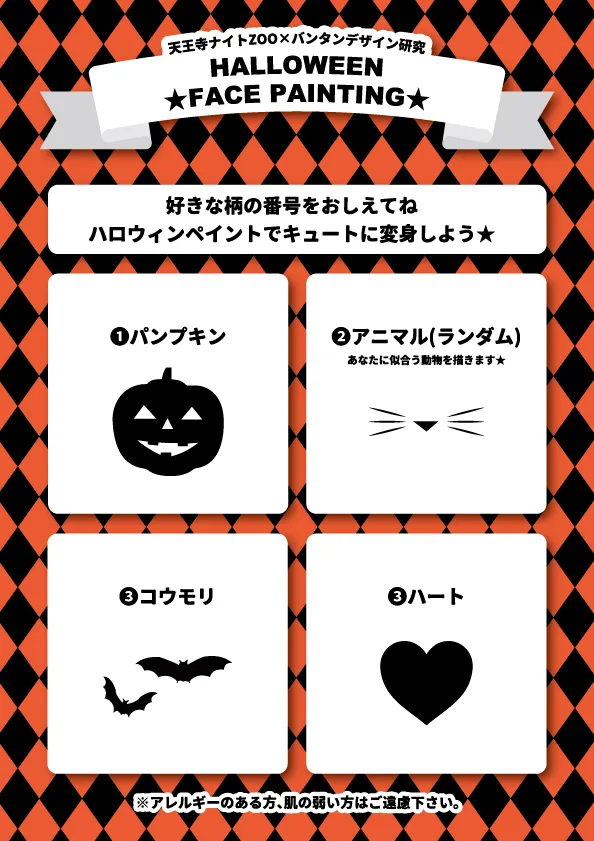ハロウィン定番のデザインから、学生が考えたデザインなど「ハロウィンナイトZOO」を盛り上げるフェイスペイントを実施します。一人当たり5分から10分程度のペイントを予定しています