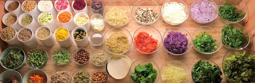 有機野菜、有機玄米、無農薬スプラウト、クレンズスープ、トルティーヤ、バゲット等、40種類前後の食材をオリジナルドレッシングで一日中食べ放題、テイクアウト時詰め放題できます。