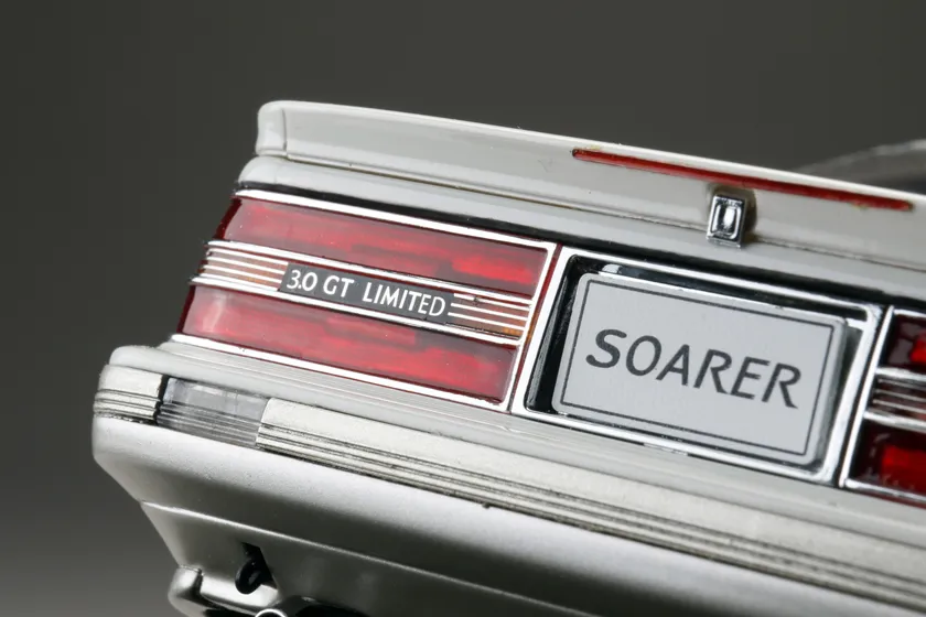 ホビージャパンでは実車の魅力を再現する為に、基本車両をデジタルスキャニングし、元実車プロモデラーである専属原型師がスケールに合わせたチューニングを施し原型を製作しました。素材にもこだわり、加工性の高いポリウレタンレジン素材をボディに採用し、窓に映りこむ光さえも再現するために、透明樹脂製パーツをウインドに採用し曲率を再現しました。強度と真円性が求められるホイールにはプラスティック製成型品を採用し、ゴムの質感にこだわりタイヤには軟質樹脂を使用しています。MZ21型の特徴である、「D-TV アンテナシステム」「エレクトロ・マルチビジョン(リモコン付き)」やリアウインドの「AIR SUSPENSION」のステッカーも再現されています。ホビージャパンは最新技術、職人技、こだわりで、国産最高級クーペである「トヨタ ソアラ 3.0GT リミテッド (MZ21) 1990 エアサスペンション仕様」を1/18スケールで復活させます。