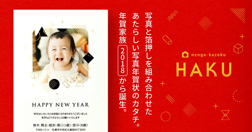 2018年、年賀家族からスペシャルな「HAKU」年賀状が誕生しました。おしゃれモダンな写真年賀状に、キラキラと輝く箔押し加工をプラス。ここでしか手に入らない特別仕様のオリジナル年賀状をお届けします。