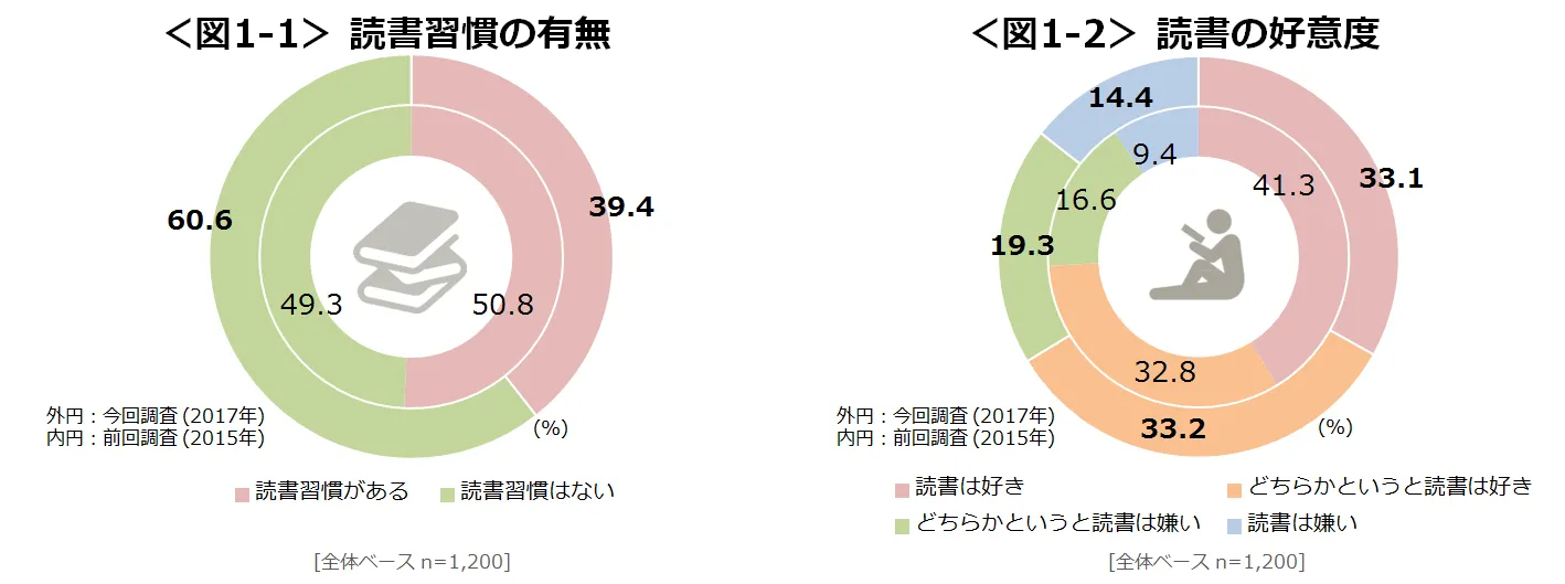 ●読書習慣の有無を、前回調査(2015年実施)と比較すると【読書習慣がある】割合が50.8%から39.4%と減少。読書の好意度でも【読書は好き・計】(読書は好き+どちらかというと読書は好き)が74.1%から66.3%と減少しており、読書人口が少なくなっていることがうかがえる。<図1-1><図1-2>