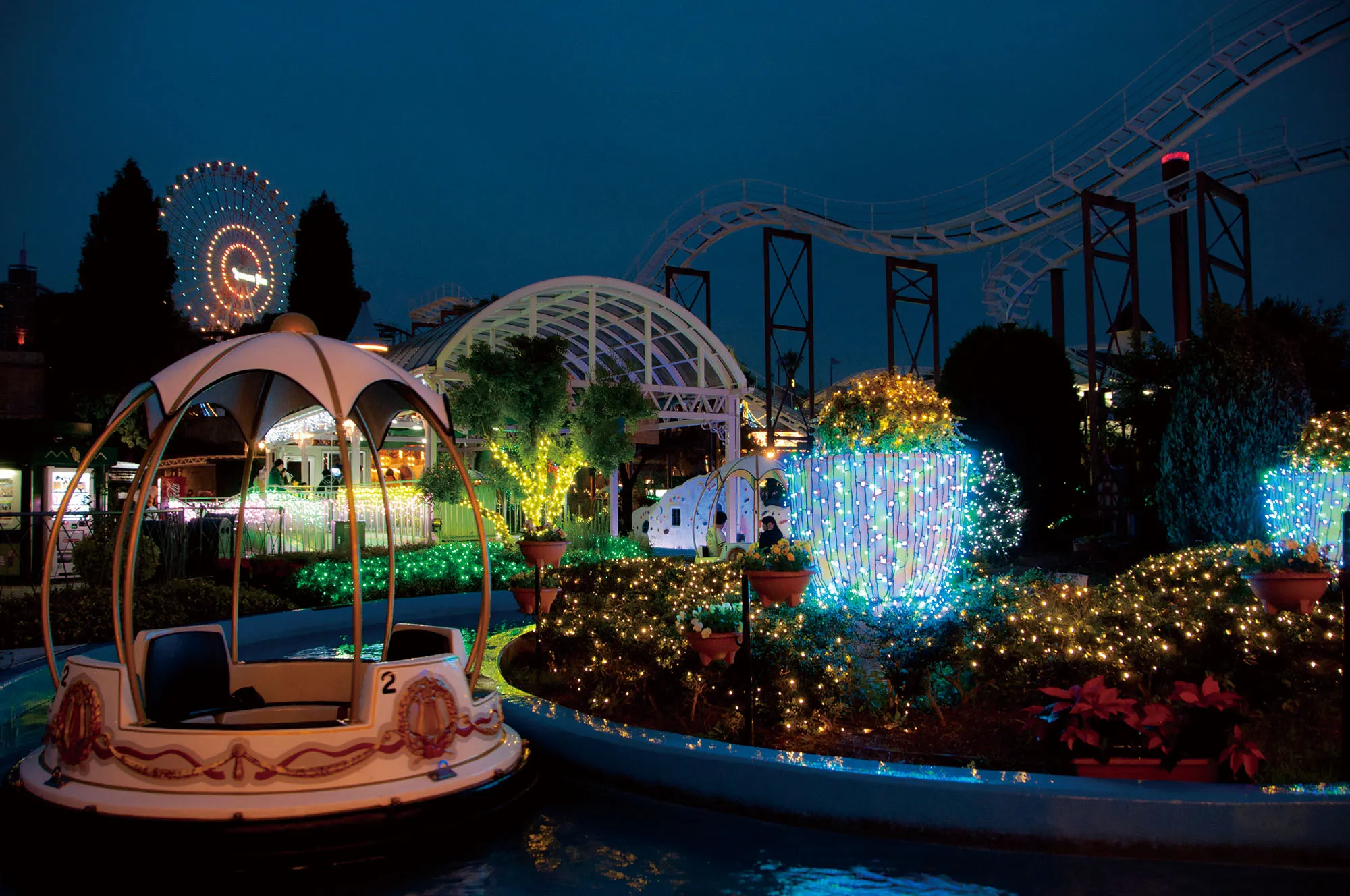 イルミネーション営業日は16時以降の入園より「ナイト料金」を設定しているので、お得にイルミネーションを楽しめます。見て、乗って、楽しめる、180万球で彩られた「光の遊園地」にご期待ください。