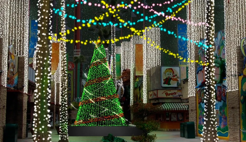 光の柱に囲まれたメインストリートに、高さ約10メートルのツリーが登場。ツリーの周りには飛び交う妖精の装飾を施しています。