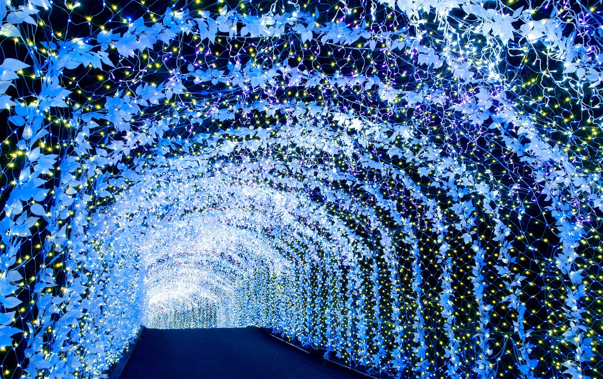 約70m続くアーケード状の光のトンネル。眺める向きで色が変わって見えるように装飾しており、トンネルの途中で振り返ることで不思議な色の変化を体験することができます。