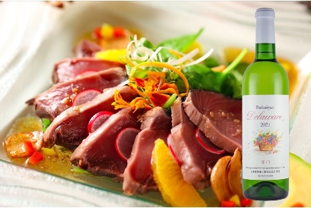 かつおのカルパッチョとのペアリングにお薦めな「デラウェア甘口’21 (ルバイヤート)」。