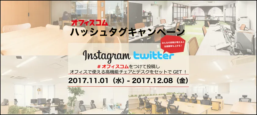 オフィス用の家具販売から内装工事までをトータルに手掛けるオフィスコム株式会社(本社:東京都千代田区、代表取締役社長:室木 剛、以下 オフィスコム)は、2017年11月1日(水)から12月8日(金)までの期間限定で、『めざせ2000投稿!ハッシュタグキャンペーン』を開催いたします。