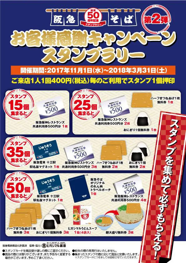 株式会社阪急阪神レストランズ(本社:大阪市北区/代表取締役社長 森本 正伸)では、「阪急そば」開業50周年を記念し、スタンプを集めると必ずもらえる「お客様感謝キャンペーンスタンプラリー第2弾」を開催いたします。