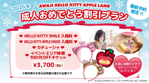 内 容: メディアアート&レストラン「HELLO KITTY SMILE」入場券とハローキティのりんごのお家「HELLO KITTY APPLE HOUSE」入場券に加えHELLO KITTY SMILEのオリジナル カチューシャや大人気の素焼き絵付け体験などができるイベントエリアでご利用いただける100円割引チケットがセットになった新成人限定プラン