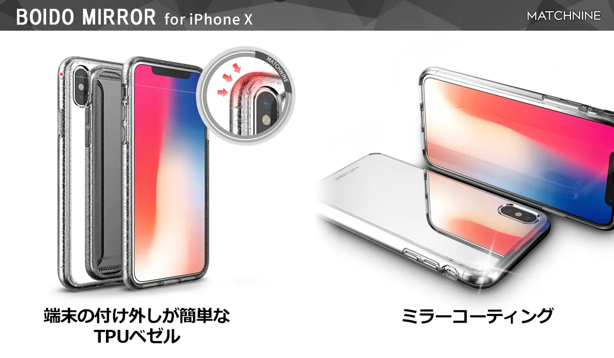 モバイルケース・アクセサリー専門の株式会社ロア・インターナショナル(所在地:東京都新宿区、代表取締役社長:Ally Won)は、高品質なモバイルアクセサリーを提供するブランド「Matchnine(マッチナイン)」から、鮮明で歪みのないミラーコーティングがされた背面が特徴のiPhone X専用ケース「BOIDO MIRROR(ボイドミラー)」を発売しました。