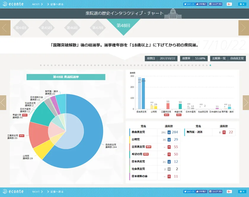 株式会社エコンテ(東京都渋谷区、代表取締役:滝日 伴則)は、1890年から現在に至る衆議院選挙の歴史をわかりやすく表現したデータに、先日10月22日に行われた衆議院選挙のデータを追加、更新しました。データをわかりやすく可視化したデータビジュアライゼーションにより、数値を見ただけでは気付かなかった傾向を、直感的に把握することができます。また、今回のデータビジュアライゼーションは、モバイルユーザーを意識して、ユーザーの画面サイズに応じて表示デザインが最適化される「レスポンシブWebデザイン」を取り入れています。