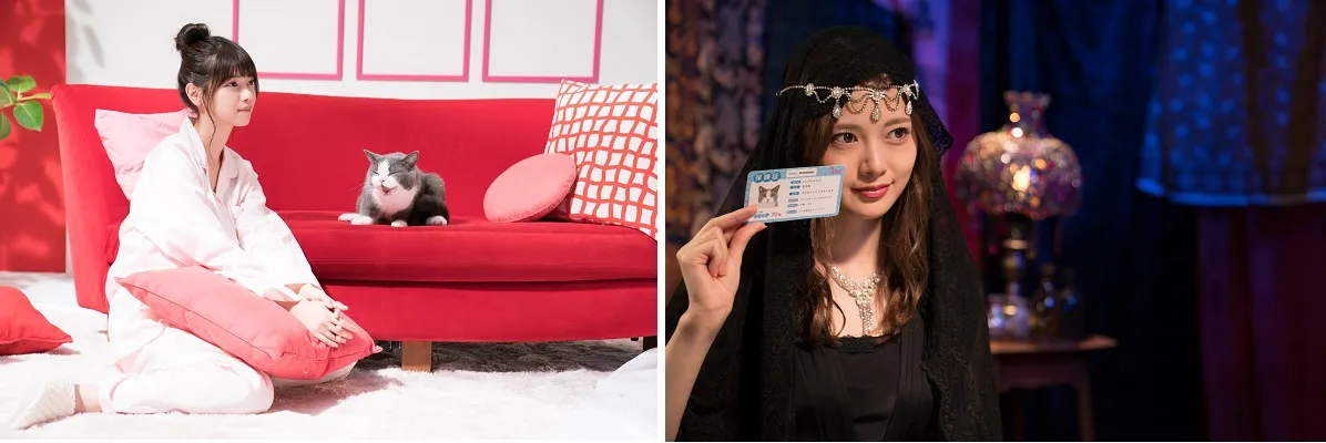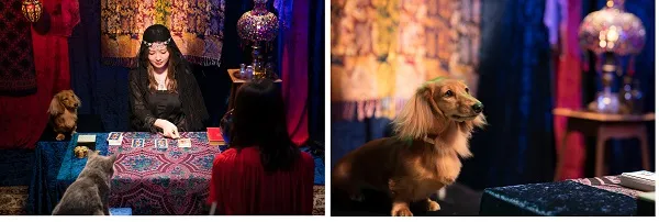 「占い篇」の撮影では、周りが赤や青のレースカーテンで囲まれた占いの館風のセットに、黒い衣装とベールを身にまとったミステリアスな雰囲気の白石さんが登場。タロットカードをさばきながら、にっこりと微笑む姿が印象的でした。撮影が終盤に差し掛かると、特に動物は集中力を保つのはとっても大変。それぞれの飼い主さんがワンちゃん、猫ちゃんの気を引くも、好奇心旺盛な猫ちゃんは、周りが気になる様子。優しく見つめる白石さんと西野さん。カットがかかる度、ワンちゃん猫ちゃんに微笑んだり、話しかけたりするお二人の姿にスタッフ一同、ほっこりしました。