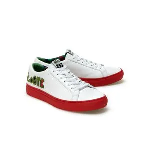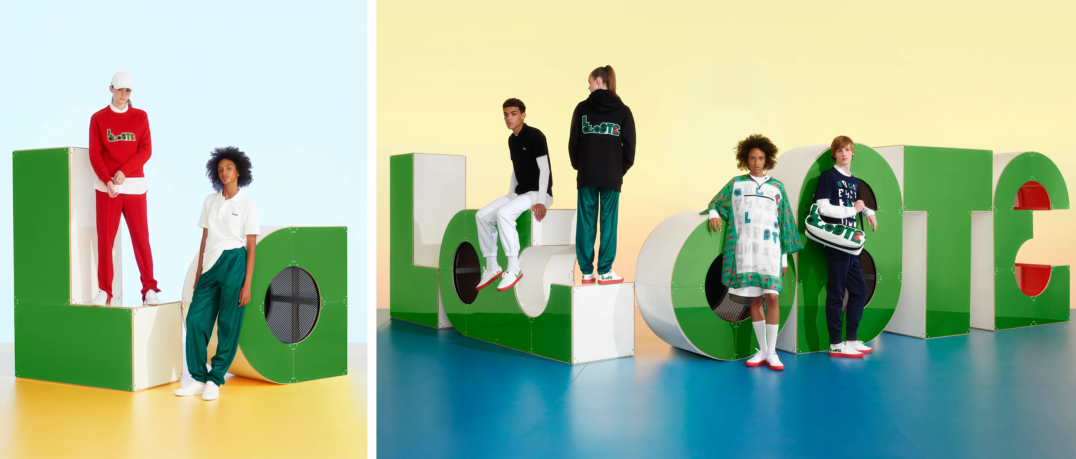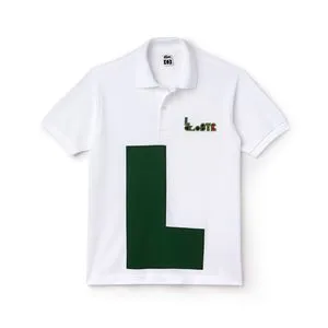LACOSTEの定番カラーであるホワイト、ネイビー、レッド、スカイブルーまたはフラミンゴ ピンクで製造された衣類はどれも、グリーンとレッドのツートンカラーのレタリングで LACOSTEのロゴが刺繍されています。この刺繍が、半袖のポロシャツのワニにとって代わり、セーター、ヘッドバンドあるいはリストバンドでは製品の中央部に移動し、ユニセックスな T シャツではアルファベットの26文字すべてが使用され、そのうち LACOSTE の綴り文字のみにカラーがあしらわれています。これらのグラフィックはリバーシブルのANNAバッグの一面に使用され、M/M (Paris) の反復パターンのプリントです。LACOSTEのパッチで飾られ、赤い靴底を合わせた白い L.12.12. スニーカーも展開されます。