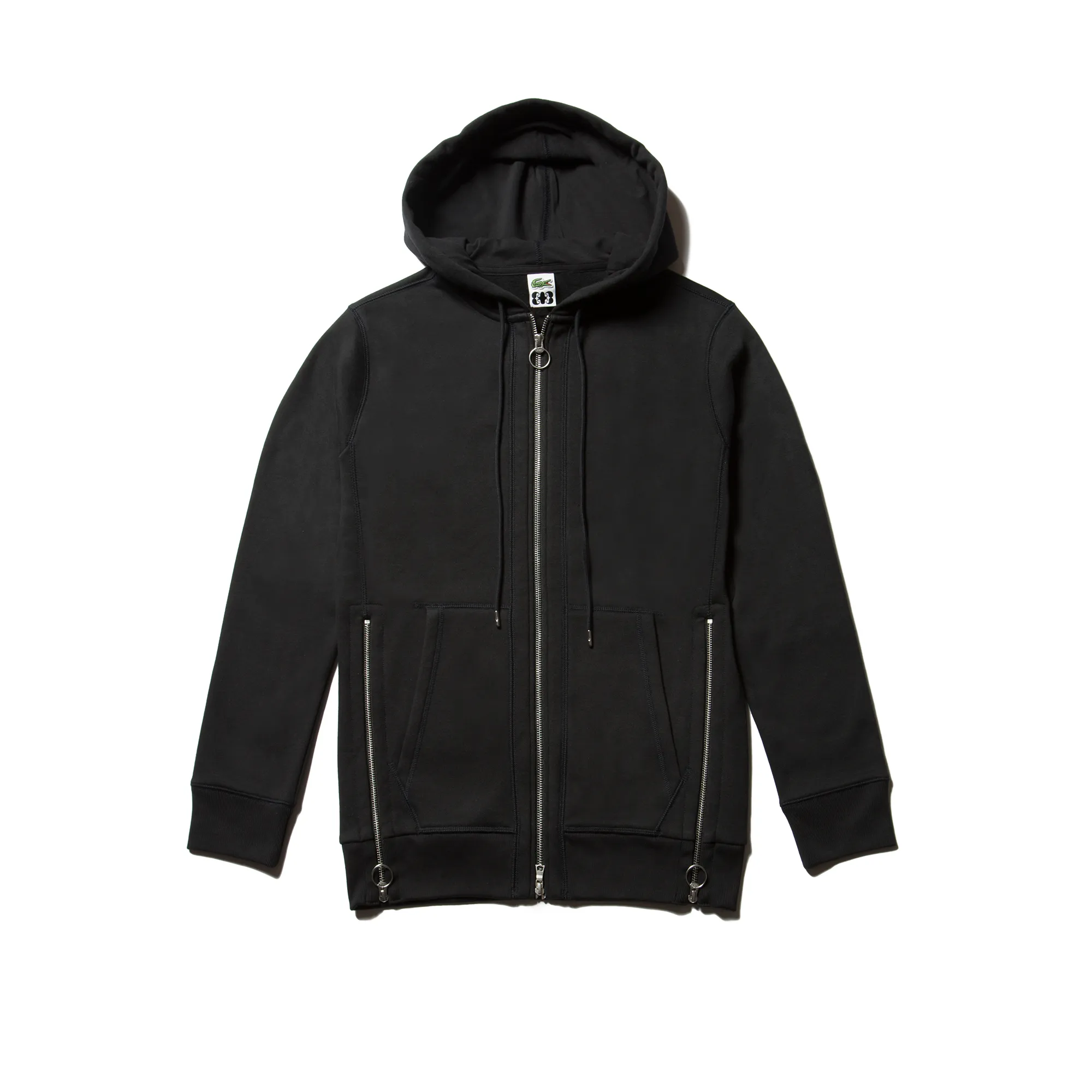ポロシャツの days of the week(週日)バージョンを提案します。L A C O S T Eの7文字が使用され、7種類のポロシャツはそれぞれ1文字が他より大きなサイズで、ワニのロゴの箇所に刺繍でほどこされています。他にもヘザーグレーまたはシンプルなブラックのパーカー と、アルファベットと M/M (Paris) プリントを合わせたグラフィックなポンチョも含まれています。
