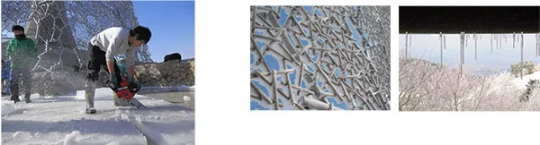 「氷棚」にできた天然の氷を切り出し、その氷を夏まで貯蔵するため、「氷室(ひむろ)」に氷を運び入れる「氷の切り出し」を毎年大寒の日に行います。