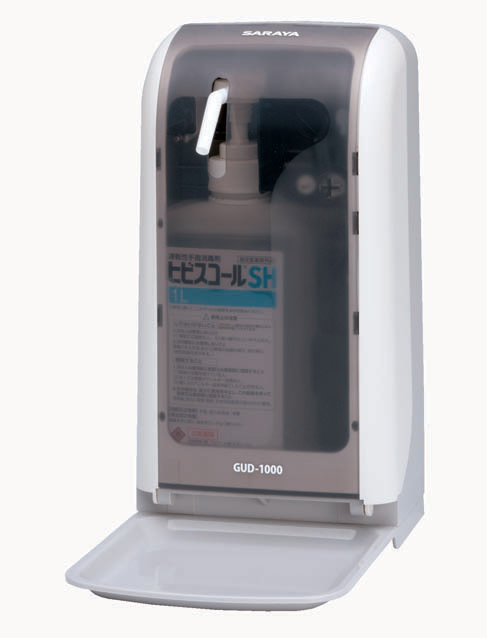 「GUD‐1000」今年の1月に発売しましたノータッチ式ディスペンサー「GUD‐1000」は、感染症対策として、オフィスや公共施設など、公衆衛生の適所に配備されているアルコール消毒剤を介して起こる、交差汚染(※1)のリスクを回避するための、「ノータッチ式」(センサー感知方式)ディスペンサーです。