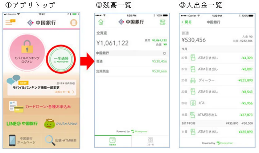 中国銀行(所在地:岡山市北区丸の内一丁目15番20号、頭取:宮長 雅人)では、フィンテックへの取組みの一環として、マネーツリー株式会社(所在地:東京都渋谷区、代表取締役:ポール チャップマン)と連携し、「一生通帳 by Moneytree」の取扱いを2017年11月1日(水)より開始しましたのでお知らせいたします。