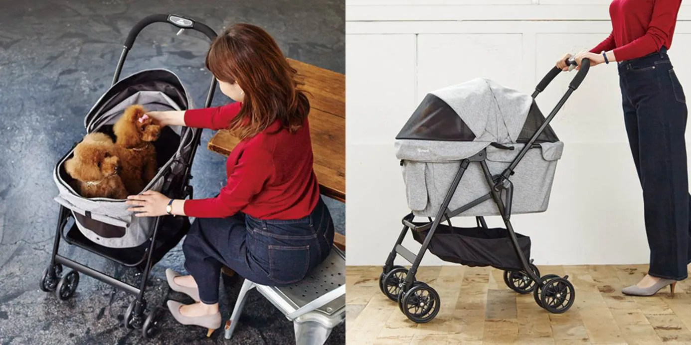 中型犬や猫ちゃん、多頭飼いにも最適なゆったりサイズのペットカートに押しやすさと持ち運びやすさを備えた5.kgの軽量タイプが新登場。開閉しやすいファスナー式の幌でペットの抜け出しを防止します。