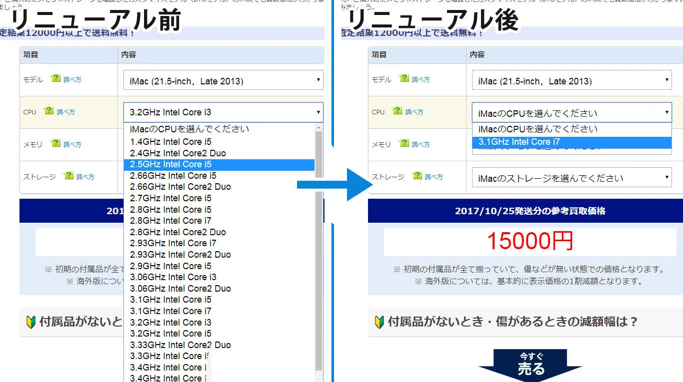 あなたのiMacのモデル、CPU、メモリ、ストレージを選択するだけで、iMacの参考買取価格がスグわかります。更に、今回のリニューアルでは、選んだモデルに応じて自動的に対応しているCPUのみ表示されるようになりました。