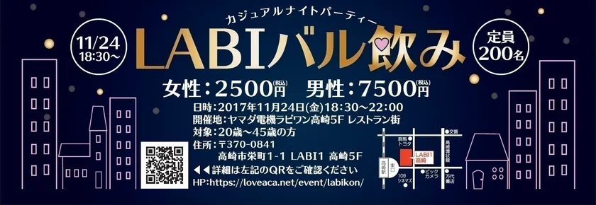 ラブアカデミー(所在地:群馬県富岡市、代表:新井 浩文)は、レストラン周遊型の街コン「ラビ高崎バル街コン」を2017年11月24日(金)に群馬県高崎市 ラビワン高崎レストラン街にて開催いたします。