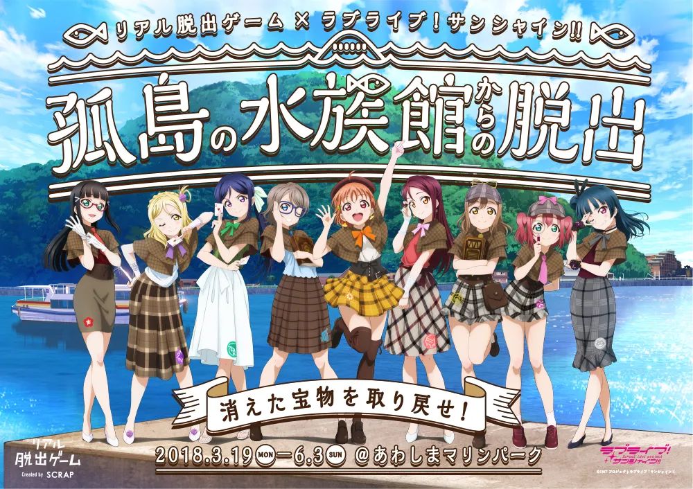 「孤島の水族館からの脱出」は、2018年3月19日(月)より開催する、実際にアニメ「ラブライブ!サンシャイン!!」の舞台である<あわしまマリンパーク>へ行き、メンバーの音声を聞きながら謎を解く体験型ゲーム・イベントです。謎解きキットとイベント専用の音声ガイドアプリ(無料)を使用し、メンバーの声を頼りにあわしまマリンパークに仕掛けられた謎を解き明かします。音声ガイドアプリで使用するメンバーの声は、すべて豪華録り下ろしとなっており、本イベントでしか聞けないメンバーの声をお楽しみいただけます。