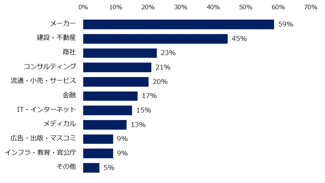 活躍できる転職先企業が多い業界のトップは「メーカー」(59%)でした。「既存社員も幅広い年代の方が勤務している」「技術継承における若手の不足で、中高年層にもニーズがある」「変化の激しい業界より、保有知識の蓄積が強みになる業界のほうがミドルは活躍しやすいから」など年齢や経験が活かせる業界であることを挙げる声が多く寄せられました。