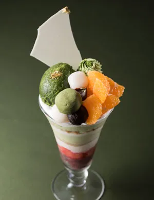 お子さまからご年配の方まで幅広い世代に愛され続けている「苺大福」。そのもちもちした食感、苺の酸味、なめらかな舌触りのクリームの甘みが相まって、絶妙な味わいをパフェの中で表現。さらに、訪日外国人観光客で賑わいをみせるシーズンに、人気の“抹茶”を取り入れたアイスや焼き抹茶と、冬の果物・みかんや栗、など14層の多彩な味わいも1つのグラスの中で楽しめるおすすめスイーツです。