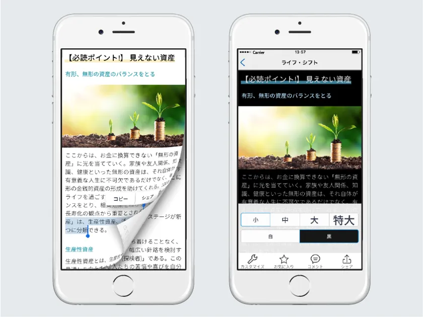 ・要約コンテンツを読む際に「めくる動作」を加えたほか、背景色・文字の大きさをフッターメニューから選べるようになり、より快適に要約を楽しめるようになりました