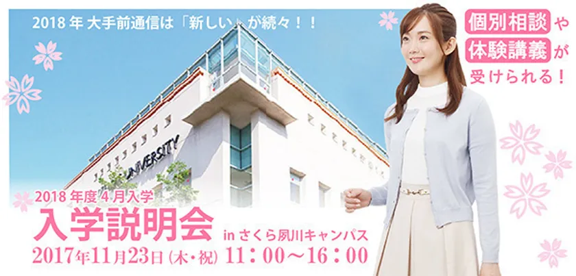 通信制大学の「大手前大学 通信教育部」は、2017年11月23日(木・祝)11:00~16:00に、同大学のさくら夙川キャンパスにて2018年度4月入学を希望されている方に対しての入学説明会を開催します。