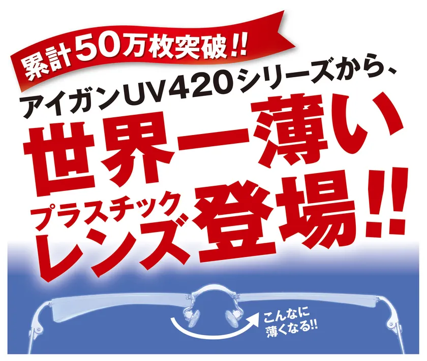 眼鏡専門店「メガネのアイガン」を運営する愛眼株式会社(本社:大阪市天王寺区、代表取締役社長:下條 三千夫)は、2015年から販売を開始した、自社企画の目の健康対策レンズ『アイガンUV420』シリーズに、新たに【世界一薄いプラスチックレンズ(※1)『アイガンKKUV420 1.76WAS(日本製)』】を新製品として2017年11月1日(水)に全国発売いたします。同シリーズは発売以降、目の健康需要の高まりと共に販売数を伸ばし2017年9月末で累計販売枚数50万枚を突破し幅広い年齢層方(※2)に使用していただいております。